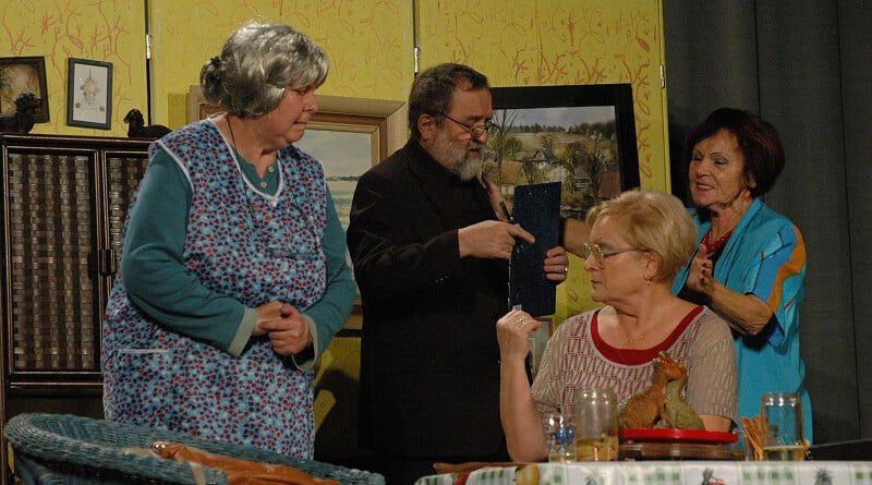 JB: Nové herce jsme přes upřímnou snahu několik let nesehnali. Několik  se jich odstěhovalo a několik bohužel také, ale na věčnost. Až teď se na nás štěstí usmálo. Dva zkušení herci (Jarda Vojta a Luděk Civín), kteří drželi pauzu, se nám vrátili, Pepa Hájek se k nám přistěhoval z Ostrova, kde hrál v místním souboru a jeden nový herec, Jakub Mráz, je můj zeť, takže musel. A protože je právník, je k tomu jako stvořený a v nové hře už hraje. Pokud jde o herečky, máme  dvě nové. Jedna Veronika se přihlásila sama a s druhou Veronikou jsem už před lety něco zkoušel, takže se stačilo jen zmínit.