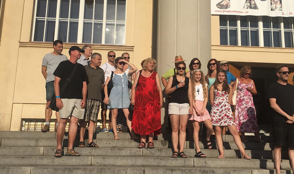 Fotokvíz 09 – Na fotografii je zachycena divadelnice v červených šatech. Jedná se o principálku jednoho pražského souboru, která během festivalu JH prodává, na schodech Jiráskova divadla, vzdělávací knihy seminaristům. Jak se tato divadelnice jmenuje celým jménem?