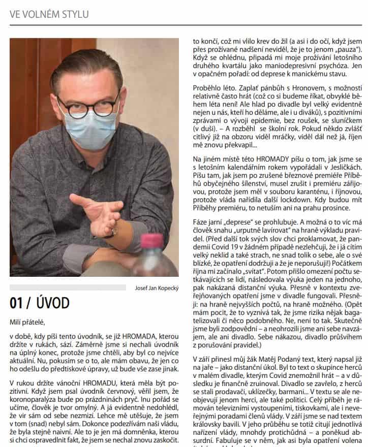 JJK: HROMADU tvoříme vlastně vždy půl roku. Půl roku se sbírá materiál, v posledním měsíci urgujeme a sami píšeme jak o život, další měsíc zaberou korektury a tisk. Distribuce probíhá poštou. Rok 2020 byl zlomový i pro HROMADU. Jarní číslo, přestože neproběhly všechny přehlídky a všechno vzdělávání, ještě tak covidem poznamenané nebylo. Vánoční už ale v plné palbě. Proto jsme ho zaměřili právě na covid. Kateřina vybízela soubory, aby napsaly, jak se s pandemií vyrovnávají. A my už v listopadu uvažovali nad tím, jak naplníme číslo jarní-letní 2021. A plán máme, takže i kdyby covid řádil, což doufám nebude, další půl rok, HROMADA vyjde.