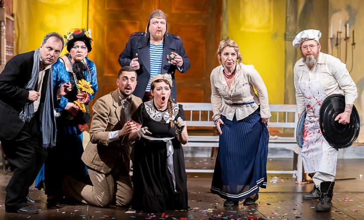 MP: Scéna a většina rekvizit jsou dílem Jana Fanyho Fanty. Jeho košatou výtvarnou imaginaci, která už tradičně zdobí všechny inscenace Slánské scény, dotvořila svým pojetím kostýmů služebně nejstarší členka souboru Hanička Kunertová. Na realizaci veškeré té pastvy pro oči se podíleli všichni ostatní členové souboru. Národní divadlo v samotné Praze by nám mohlo závidět!