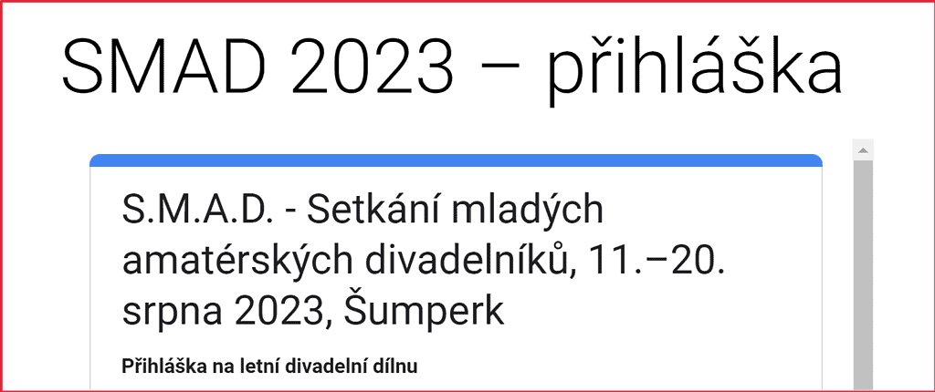 Setkání mladých amatérských divadelníků (S.M.A.D.) se každoročně koná v Šumperku již od roku 1995. Od roku 2009 je vzdělávací částí celostátní přehlídky experimentujícího divadla Šrámkův Písek. Dílny S.M.A.D. 2023 pořádají NIPOS, útvar ARTAMA, a Společnost Amatérské divadlo a svět, z. s., ve spolupráci s Divadlem Šumperk, Střední zdravotnickou školou a MÚ Šumperk. Letos jsou v nabídce dílny (třídy) čtyři. Projekt se uskuteční s finanční podporou Ministerstva kultury a města Šumperk.