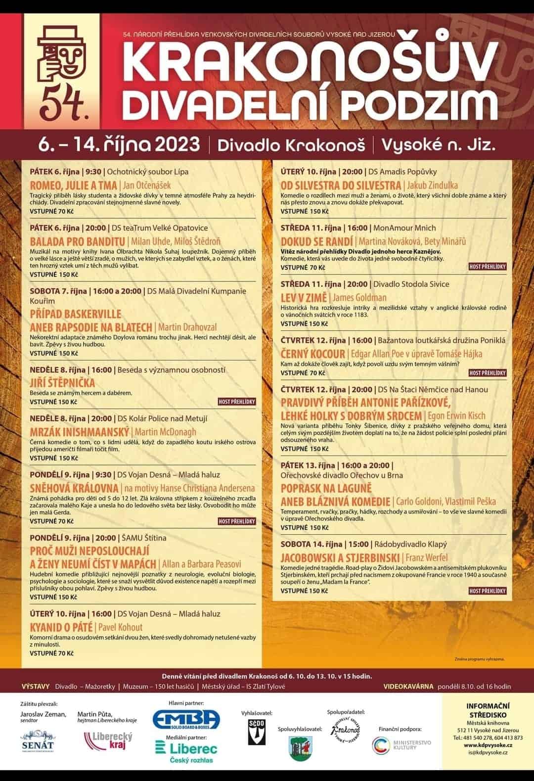 V neděli proběhne v divadle Krakonoš beseda s hercem Jiřím Štěpničkou. V pondělí dopoledne si přijdou na své děti. Mladá haluz desenského Vojanu uvede dopoledne pohádku na motivy Hanse Christiana Andersena Sněhová královna. Ve středu v 16 hodin režisérka Bety Minářů a účinkující Monika Nováková, tvůrčí tým sdružený ve spolku MonAMOUR, pozvou na rande – tedy na vítěznou inscenaci kaznějovské NP Divadla jednoho herce, uváděnou pod názvem Dokud se randí.  Ve čtvrtek v 16 hodin zaječí Černý kocour, protagonista povídky Edgara Allana Poa a meotarové inscenace ponikelského Tomáše Hájka. A v sobotu v 15 hodin proběhne komedie jedné tragédie Jacobowski a Stjerbinski autora Franze Werfela a režiséra Jaroslava Kodeše v podání Rádobydivadla Klapý. Všechny tyto akce jsou kvalitním doplněním přehlídky Krakonošův divadelní podzim 2023.